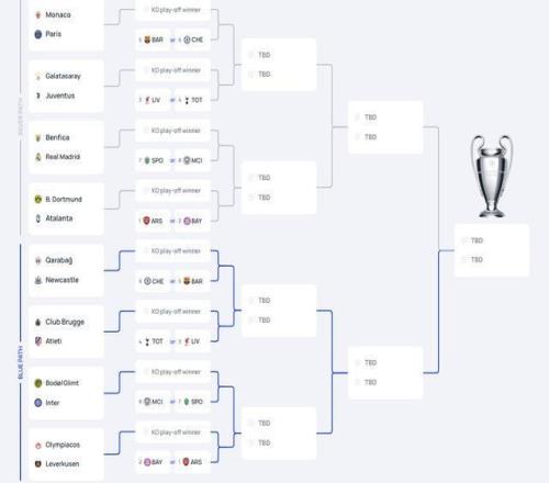 在联赛阶段结束后,1/8决赛的四组分区也已经确定。不过今晚不会确定1/8决赛的具体对阵情况,1/8决赛抽签将在附加赛结束后,于北京时间2月27日晚间进行。但直通1/8决赛的球队已经得知了自己的4个潜在对手。